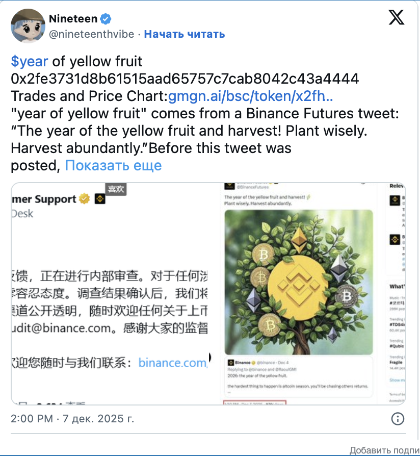 Один из примеров связан с постом Binance Futures, который содержал фразу о «желтом фрукте и урожае». Ончейн-токен с точно такой же формулировкой и изображением появился незадолго до публикации. Подобные совпадения усилили подозрения, что кто-то внутри Binance создал или поддержал этот актив.