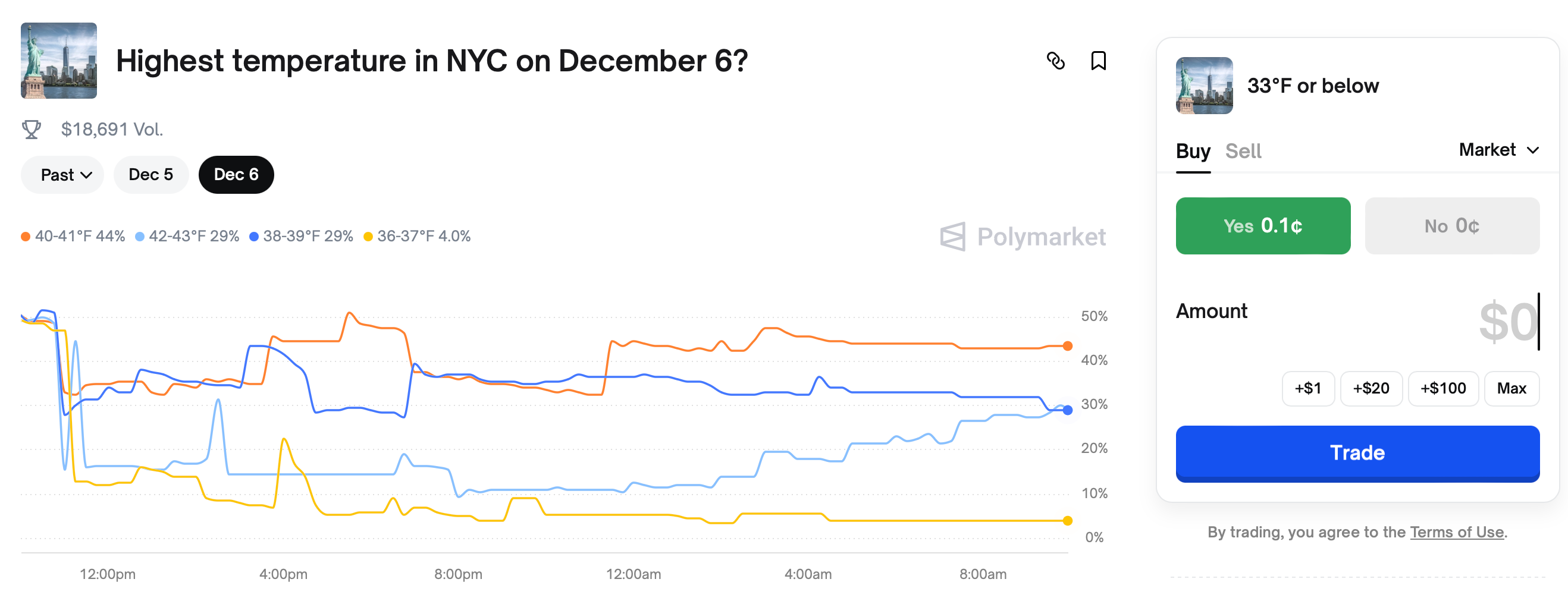 Заявки на прогноз максимальной температуры в Нью‑Йорке 6 декабря. Источник: Polymarket
