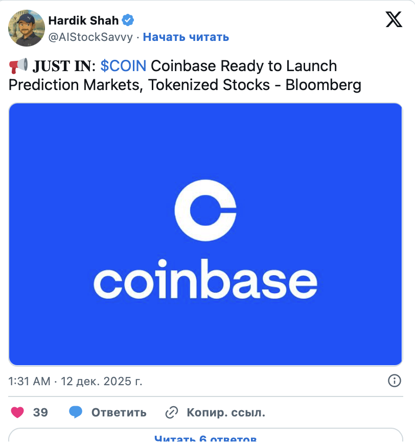 По имеющейся информации, руководство Coinbase намерено официально представить сервисы для рынков предсказаний и токенизированных акций на мероприятии 17 декабря. Ожидается, что запуск токенизированных ценных бумаг будет осуществлен собственными силами компании без привлечения сторонних партнеров.