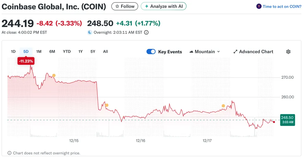 За последние сутки котировки COIN снизились на 8,4% — до $244. Сейчас акции Coinbase торгуются на минимальном уровне за семь месяцев.