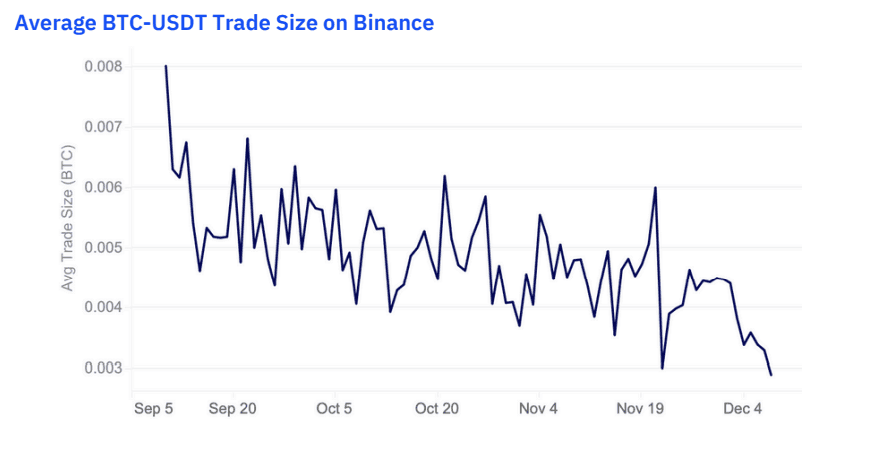 При этом средний размер сделок BTC-USDT остается небольшим и стабильным, что указывает на здоровый баланс между розничным участием и алгоритмическим исполнением.