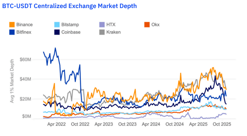Преимущество биржи в ликвидности также подчеркивает ее глубина рынка. В отчете отмечается, что этот показатель по основным активам (BTC, ETH, SOL, XRP) в диапазонах 0,1% и 1% превысили уровни до 2022 года, даже после крупных отраслевых потрясений.