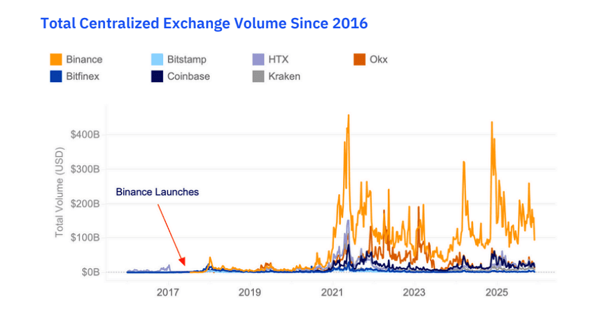 Binance удерживает примерно 60% доли спотового объема централизованных бирж, что отражает сильные и устойчивые сетевые эффекты.