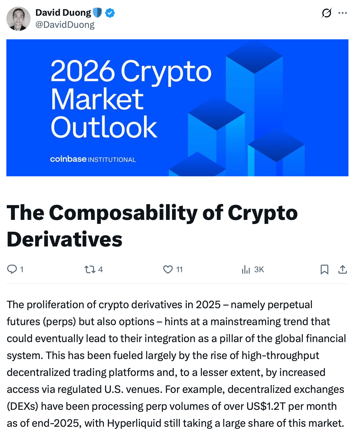 Активность на рынке криптодеривативов заметно выросла в 2025 году: трейдеры стали чаще обращаться к бессрочным фьючерсам на блокчейне, сообщил Дэвид Дуонг из Coinbase. К концу года децентрализованные биржи обрабатывали ежемесячный объем торгов бессрочными фьючерсами на сумму более $1 трлн. Это подчеркивает растущую роль децентрализованных рынков деривативов.
