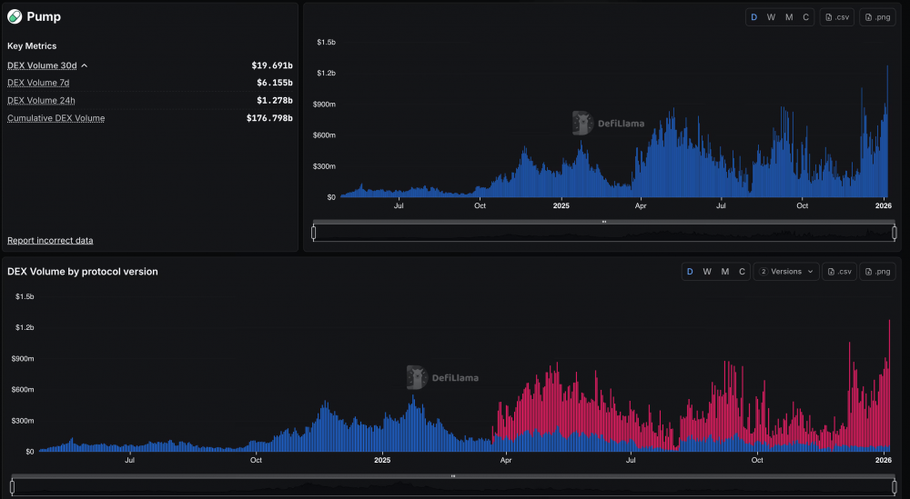 Данные, отслеживаемые DeFiLlama, показывают, что объем торгов в экосистеме Pump DEX составил 1 280 000 000 долларов за последние 24 часа, в результате чего объем за 7 дней достиг 6 150 000 000 долларов, а за 30 дней - 19 690 000 000 долларов. На сегодняшний день совокупный объем торгов составляет почти 176 800 000 000 долларов, что напоминает о том, как быстро восстанавливаются потоки розничных инвесторов, когда мемкоины привлекают внимание пользователей.