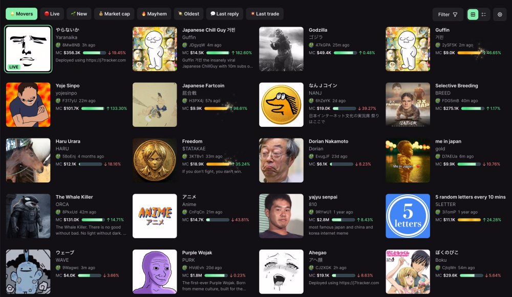 Во вторник днем в азиатских часах, похоже, преобладали токены, ориентированные на Японию и аниме, хотя эти темы могут быстро меняться в зависимости от новых тенденций или демографических характеристик пользователей, наиболее активно использующих платформу в данный момент.