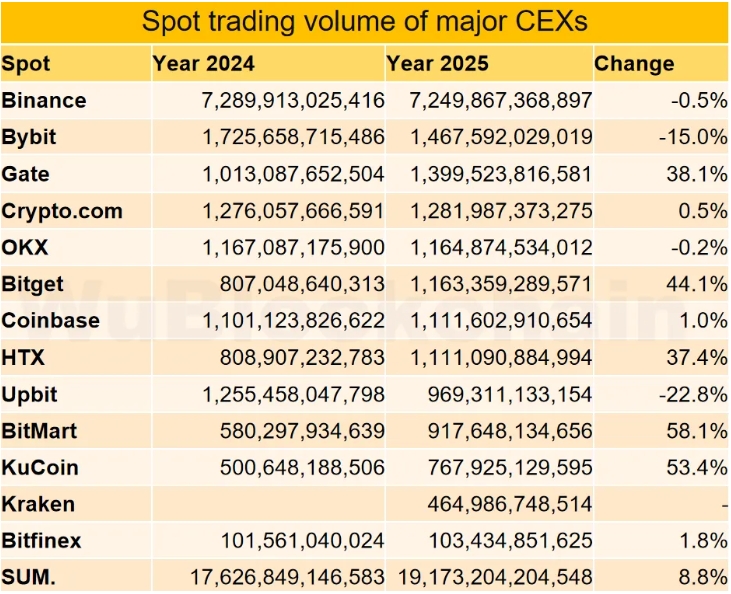 В 2025 году объем спотовых торгов на основных биржах увеличился на 8,8% по сравнению с 2024 годом, с $17,6 трлн до $19,1 трлн. Binance, Bybit и Gate заняли первые три позиции, при этом объем Binance почти в пять раз превысил объем биржи, занявшей второе место.
