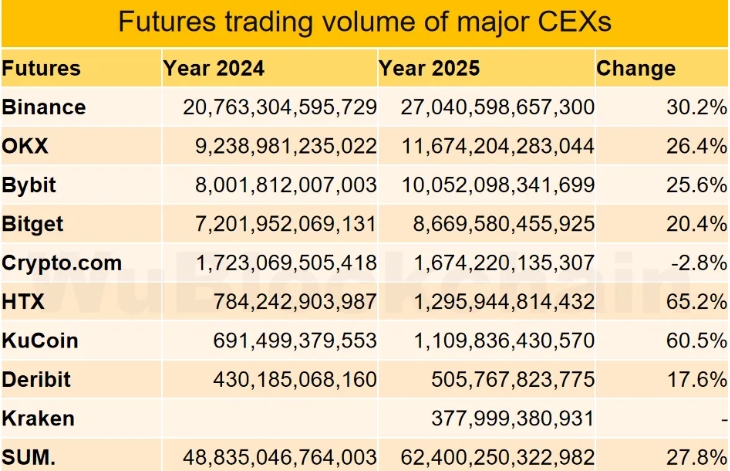 В 2025 году объем торгов деривативами на основных биржах увеличился на 27,8% по сравнению с 2024 годом, с $48,8 трлн до $62,4 трлн. Лидировали Binance, OKX и Bybit.