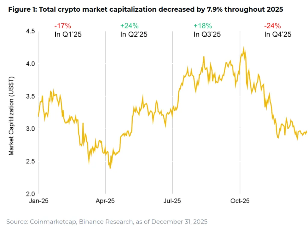Капитализация рынка достигла пика в $4,2 трлн в октябре, а в апреле опускалась до $2,4 трлн. Размах колебаний составил 76% — рекордный показатель для криптоиндустрии. Несмотря на улучшения инфраструктуры и регулирования, рынок завершил год на отметке около $3,2 трлн, потеряв 7,9%.
