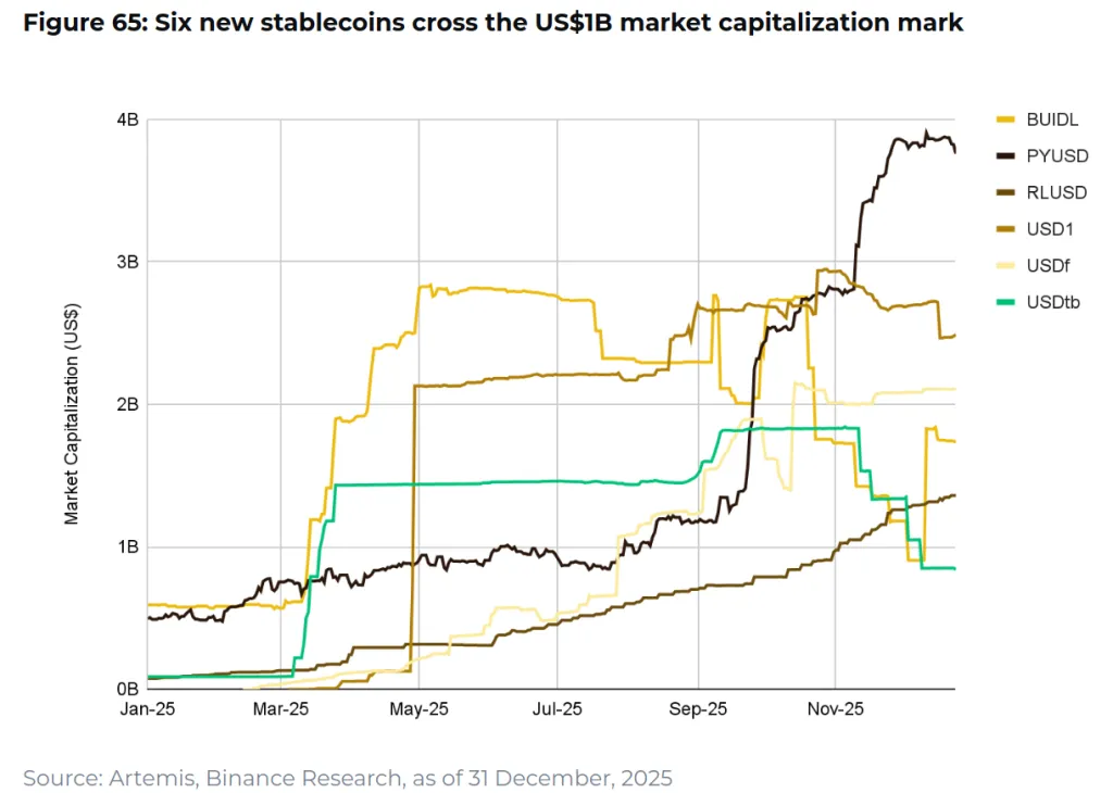 Шесть новых стейблкоинов преодолели порог капитализации в $1 млрд: BUIDL (BlackRock), PYUSD (PayPal), USD1 (World Liberty Financial), USDtB (Ethena), RLUSD (Ripple) и USDf (Falcon).