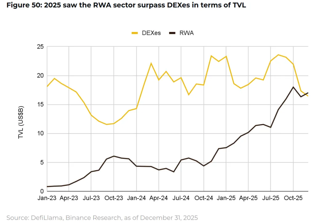 «29 декабря 2025 года в секторе произошел знаковый момент: совокупный TVL RWA официально превысил TVL DEX, достигнув $17 млрд. Это сделало RWA пятым по величине сегментом в DeFi», — говорится в отчете.