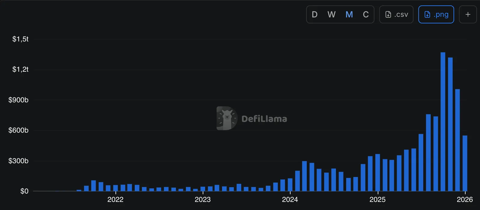 Общий оборот децентрализованных деривативов за неполный январь составил $549 млрд, что пока далеко от октябрьского рекорда в $1,3 трлн.