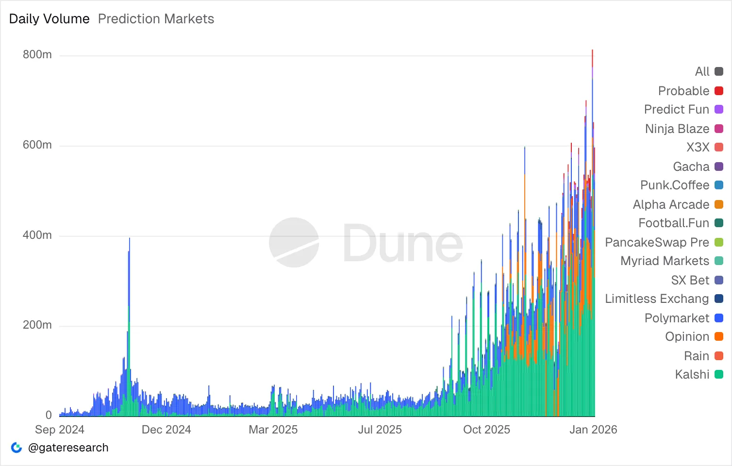 Платформы вроде Polymarket обновили исторический максимум по суточному объему торгов — показатель превысил $814 млн, свидетельствуют данные Dune.