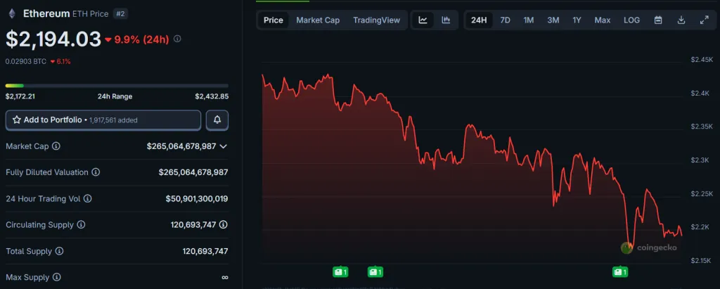 Инвестор вышел из сделки на фоне падения рынка. За последние сутки цена второй по капитализации криптовалюты упала на ~10%, опустившись до $2194.