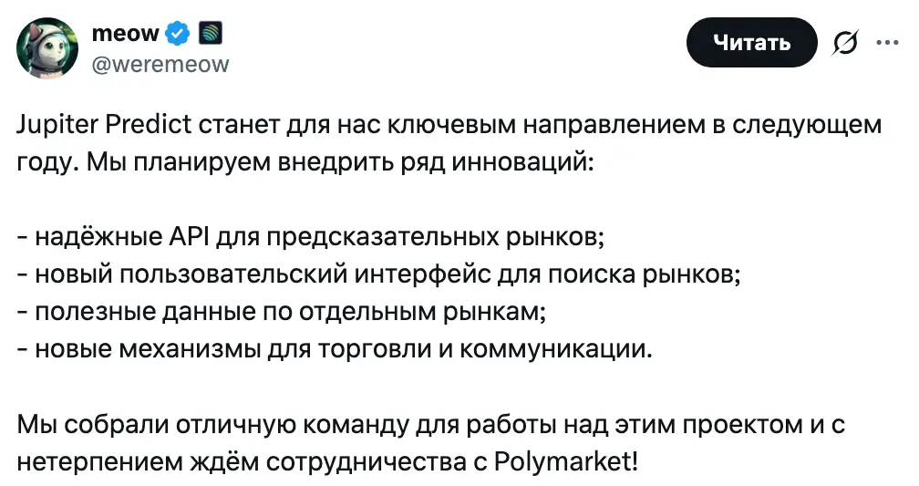 Анонимный сооснователь Jupiter по имени Meow заявил, что «Jupiter Predict» станет ключевым направлением работы в следующем году. Планируется развитие API для предсказательных рынков и обновление инструментов поиска рынков.