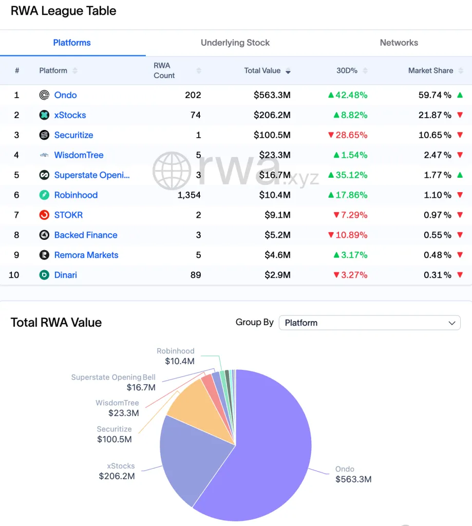 В сегменте RWA платформа Ondo Finance лидирует по числу и общей стоимости токенизированных бумаг:
