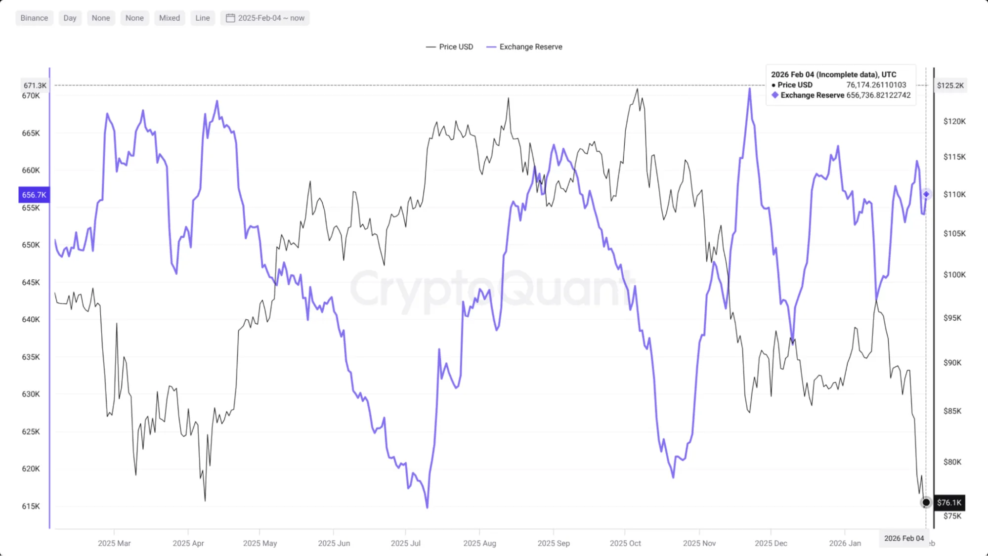По сравнению с концом 2025 года, когда резервы составляли 657 000 $BTC, показатель практически не изменился. С годового минимума (10 июля 2025) он вырос на 7%.