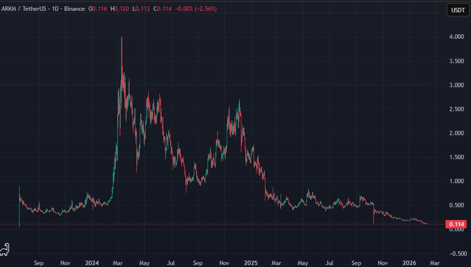 Отметим, биржа имеет собственный токен. На момент публикации ARKM торгуется около $0,12, что на 97% ниже исторического максимума в $4, который был установлен в марте 2024 года.