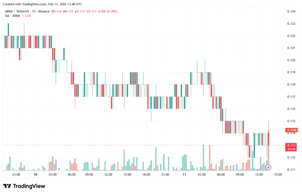 Нативный токен ARKM торгуется в районе $0,113, находясь вблизи исторического минимума ($0,1045). За неделю монета подешевела на 15%.
