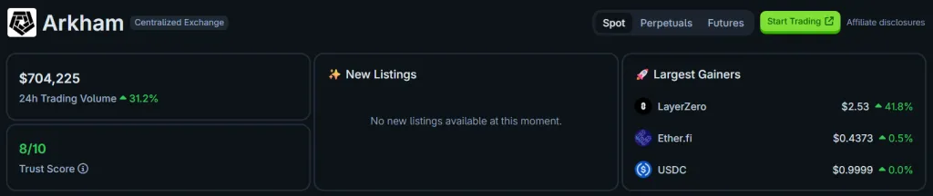 На момент написания суточный объем торгов на Arkham Exchange составляет $704 225.