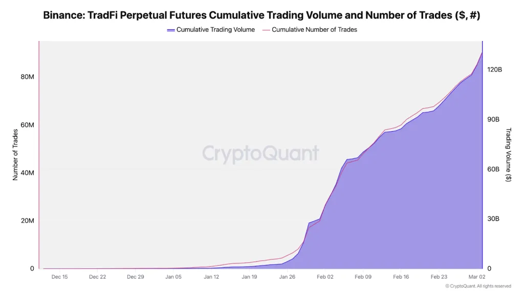 Совокупный объем торгов бессрочными контрактами на традиционные активы (TradFi Perpetual Futures) на криптобирже Binance превысил $130 млрд при 90 млн сделок спустя два месяца после запуска продукта в начале января. Об этом свидетельствуют данные CryptoQuant.