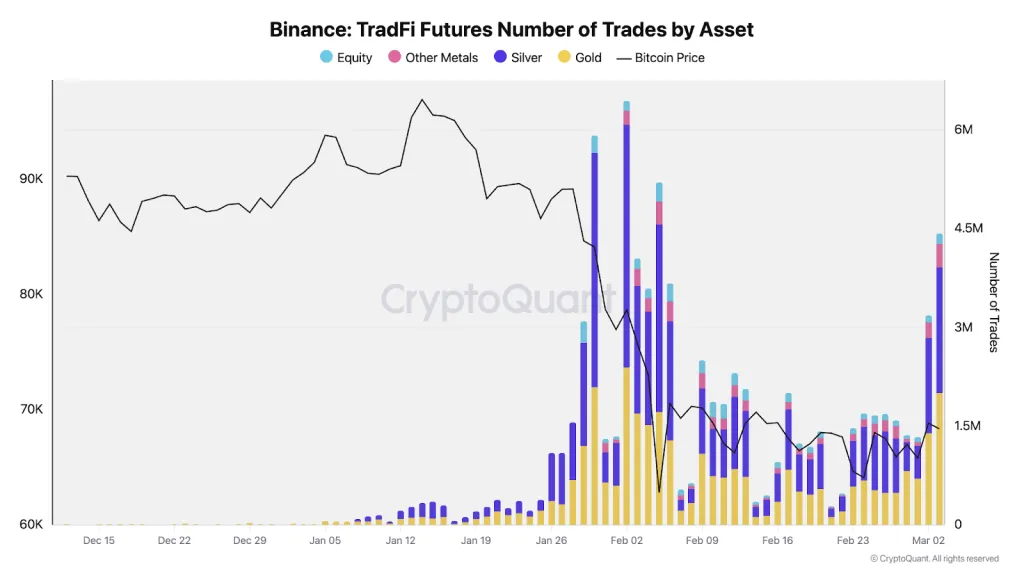 По данным CryptoQuant, золото занимает от 25% до 65% совокупного объема TradFi-фьючерсов на Binance, серебро забирает оставшуюся долю и в отдельные дни превышает 70%. В последнее время распределение стало более равномерным на фоне роста котировок серебра.