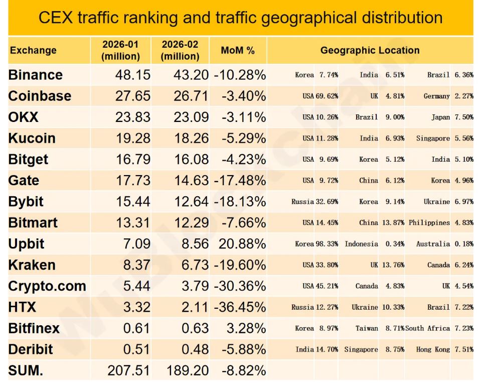 В общей сложности трафик на криптобиржах за месяц упал на 8,8%. В тройке лидеров по темпам снижения — HTX (-36%), Crypto.com (-30%) и Kraken (-19%). Рост трафика произошел только на южнокорейской Upbit (20%) и связанной с Tether бирже Bitfinex (3%).