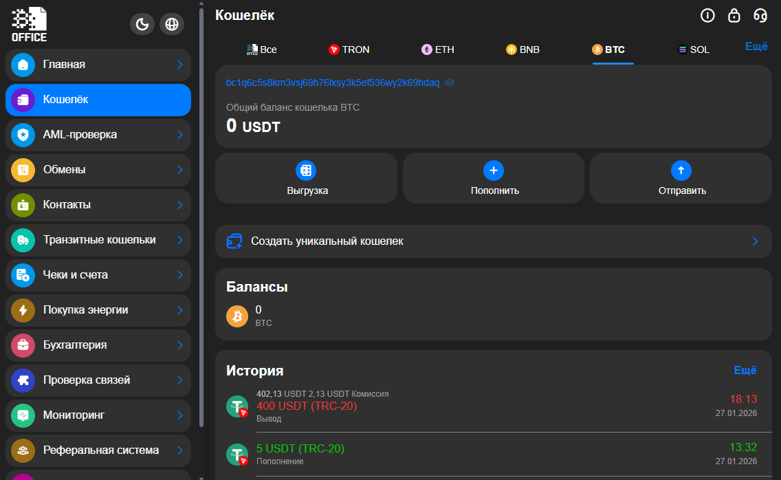 Crypto Office дает пользователям среду, в которой риски сводятся к нулю: AML-проверки, проверка связей, мониторинг, распределение потоков через транзитные кошельки.
