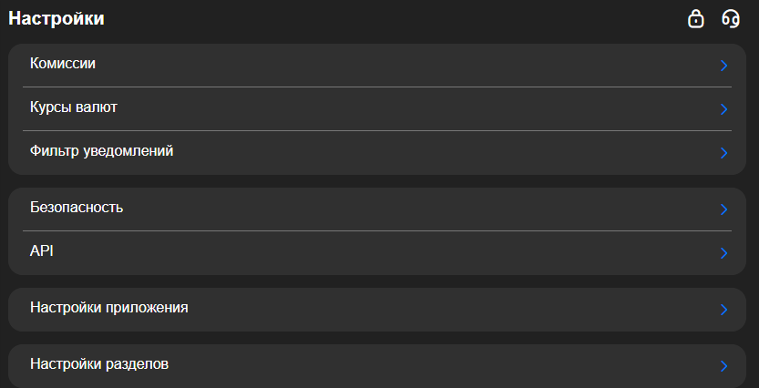 | Обмен криптовалют | Есть отдельный раздел «Обмены», поддерживаются фиксированный или рыночный курс, история операций. |