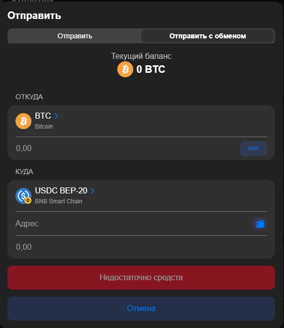 - Вы выбираете, что отправляете (например, $USDT TRC-20) и какой токен нужно получить (например, $USDT BEP-20, $BTC или $ETH);