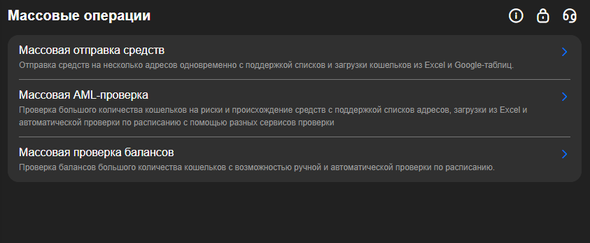 - Массовая AML-проверка для анализа Risk Score нескольких кошельков;