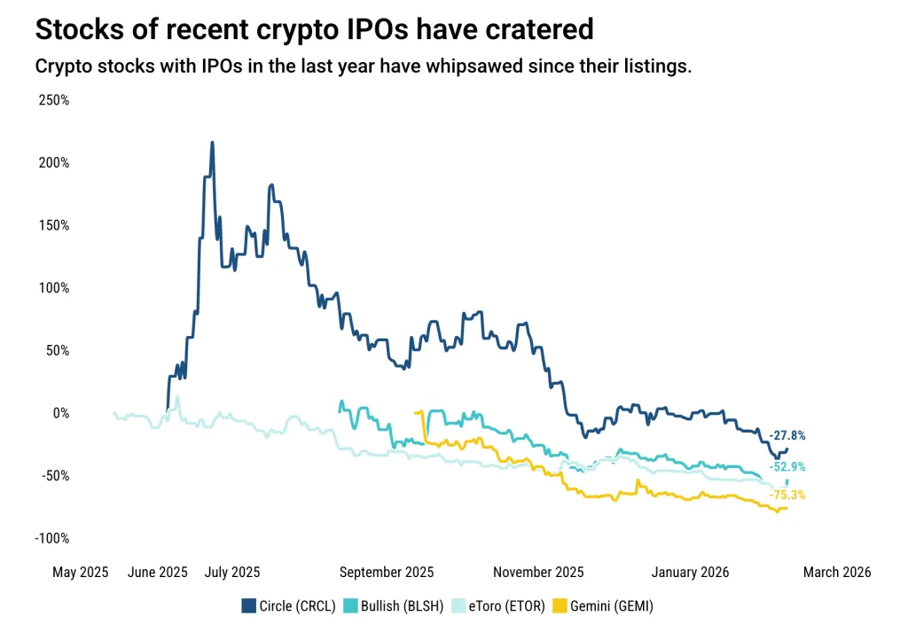 2026 год складывается немного иначе. Пока единственным состоявшимся листингом среди криптокомпаний стало размещение акций BitGo. Однако событие обернулось падением бумаг на 20% на фоне волатильности.