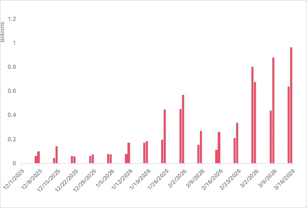 С января объемы торгов HIP-3 в выходные дни выросли в девять раз. В результате суточный оборот биржи Hyperliquid в марте достиг рекордных $5,4 млрд.