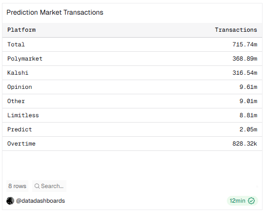 По данным Dune Analytics, в марте рынки прогнозов показали огромный рост, в результате которого количество сделок превысило 191 миллион. По сравнению с аналогичным периодом прошлого года прирост составил 2838%, среди всех платформ вперёд выбилась площадка Polymarket.