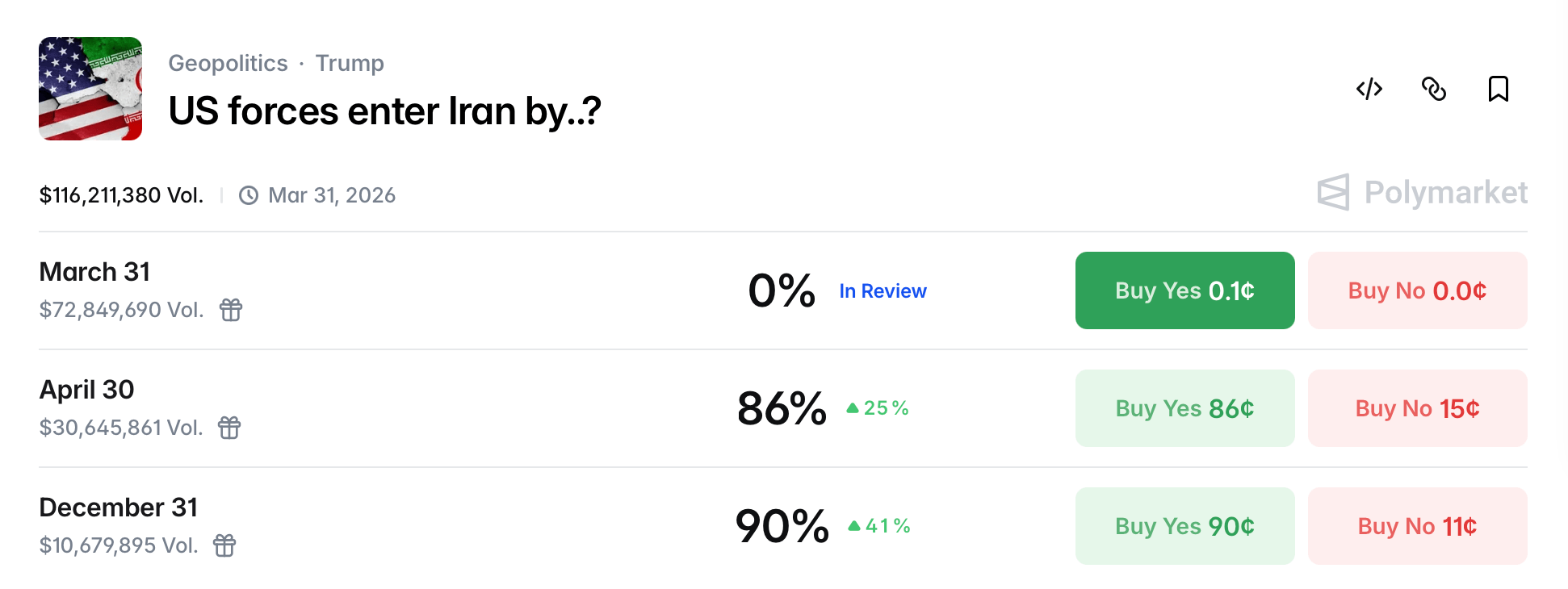 - Трейдеры Polymarket поставили 115 млн долларов на вторжение американских войск в Иран до 31 декабря, оценив вероятность этого события в 90%.