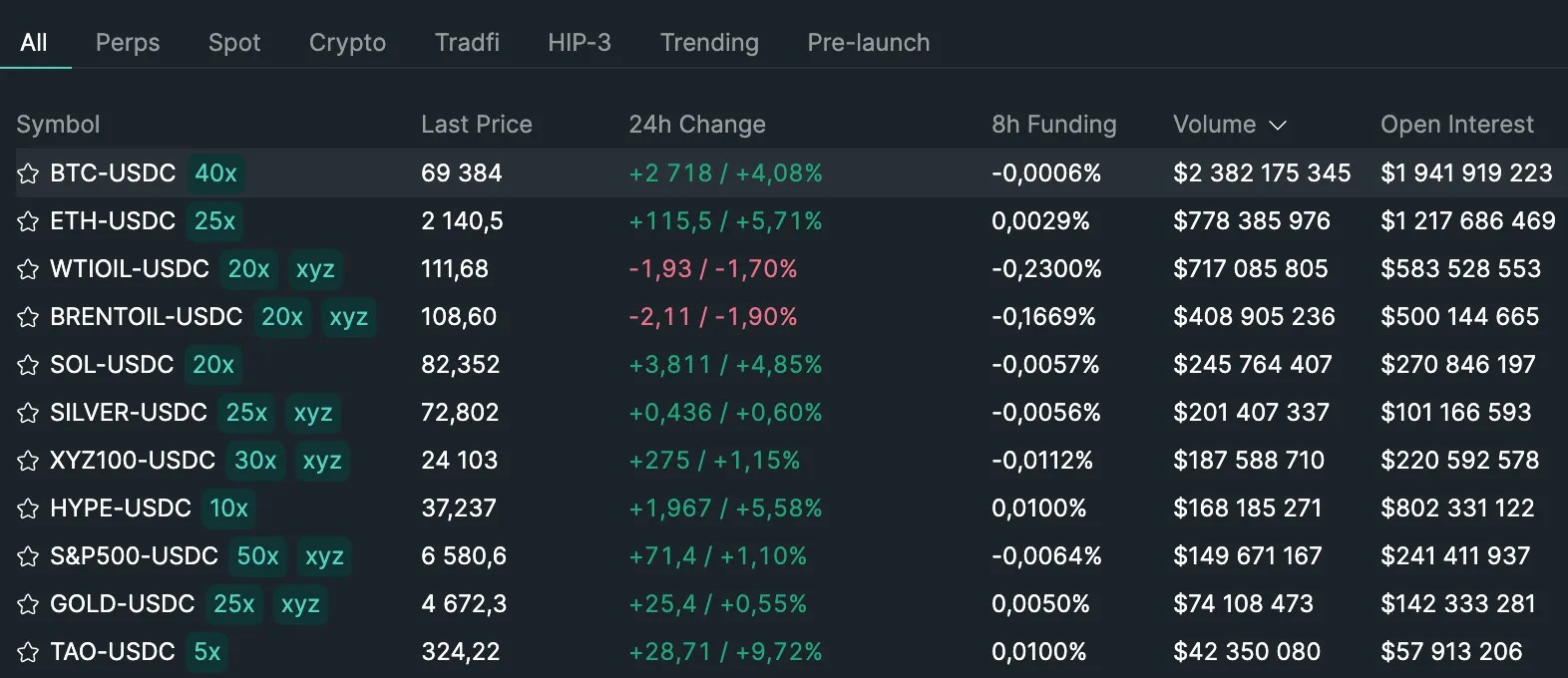 В марте суточный оборот Hyperliquid достиг рекордной отметки в $5,4 млрд. Помимо биткоина и Ethereum, в число самых популярных контрактов по-прежнему входят фьючерсы на нефть марок WTI и Brent: