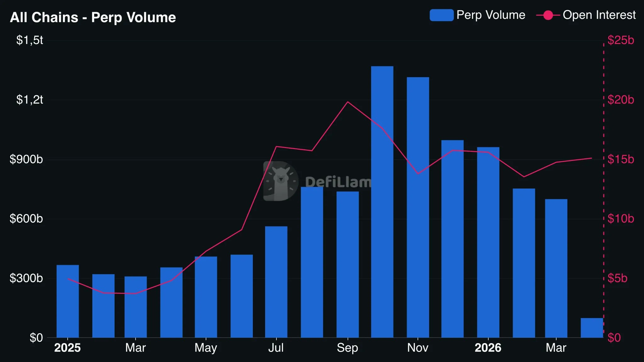 С октября 2025 года ежемесячный торговый оборот на perp-DEX снизился с $1,36 трлн до $699 млрд в марте 2026, свидетельствуют данные DefiLlama.