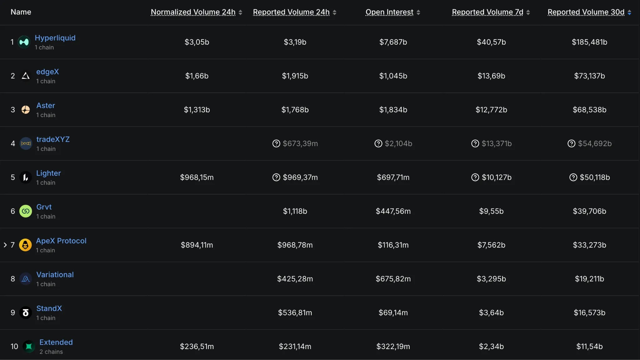 Более мелкие площадки вроде ApeX Protocol, Variational и StandX зафиксировали от $16 млрд до $33 млрд. Большая часть ончейн-активности по бессрочным фьючерсам сконцентрирована на ведущих платформах.