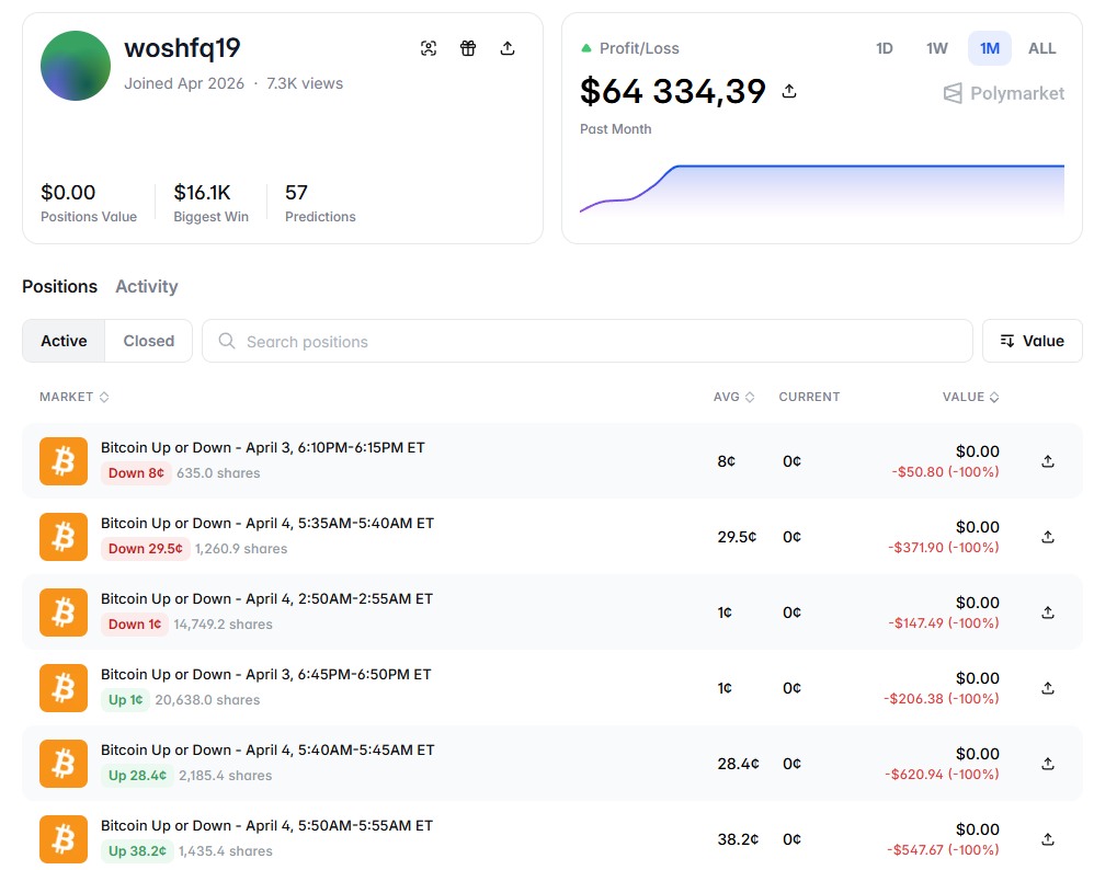 Недавно торговый бот, работающий под учётной записью «woshfq19», продемонстрировал свои способности на рынке прогнозов Polymarket. За очень короткий период, а именно за четыре дня работы, он принёс своему владельцу $64,334.