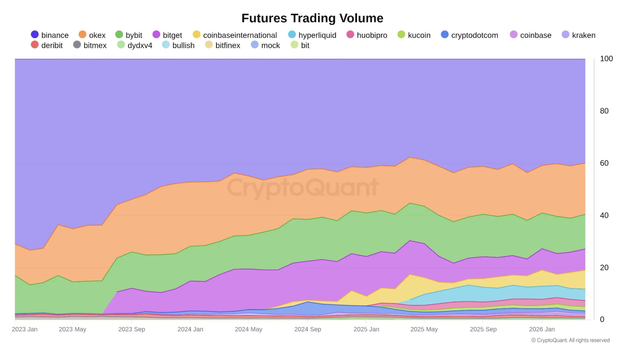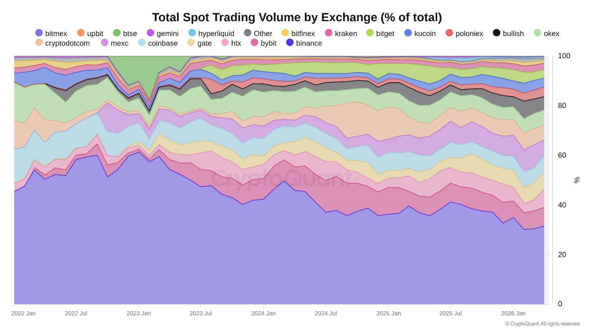 Совокупный объем торгов на централизованных криптобиржах сократился на 48% от пика октября 2025 года — до $4,3 трлн в марте 2026. Binance удержала доминирующие позиции на спотовом и фьючерсном рынках, следует из данных CryptoQuant.