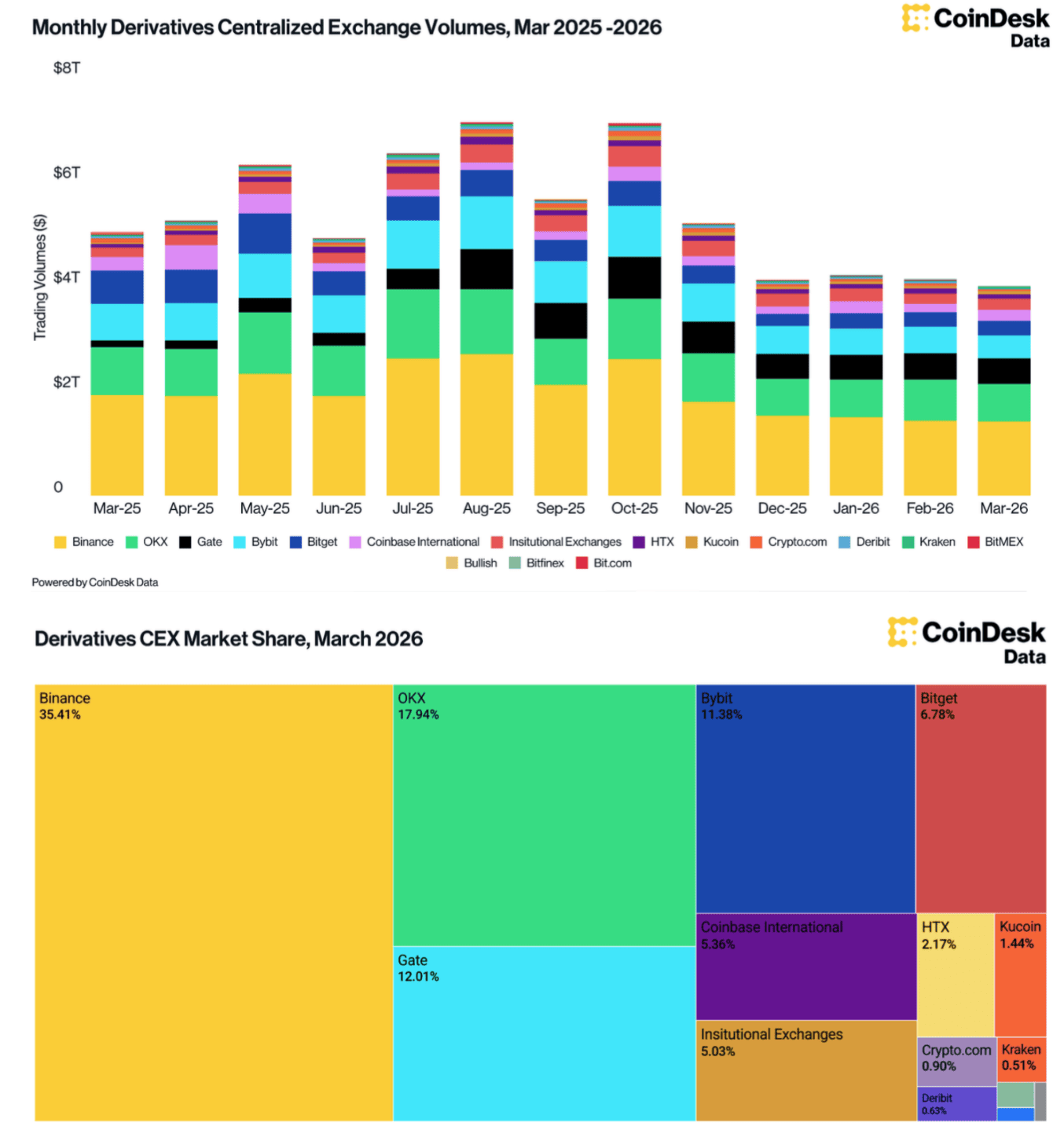 Криптовалютный рынок демонстрирует структурные изменения: торговая активность все больше концентрируется на централизованных биржах (CEX), а ключевым бенефициаром этого тренда остается Binance. Об этом говорится в пресс-релизе со ссылкой на обзор бирж CoinDesk за март 2026 года, которым представители Binance поделились с Incrypted.