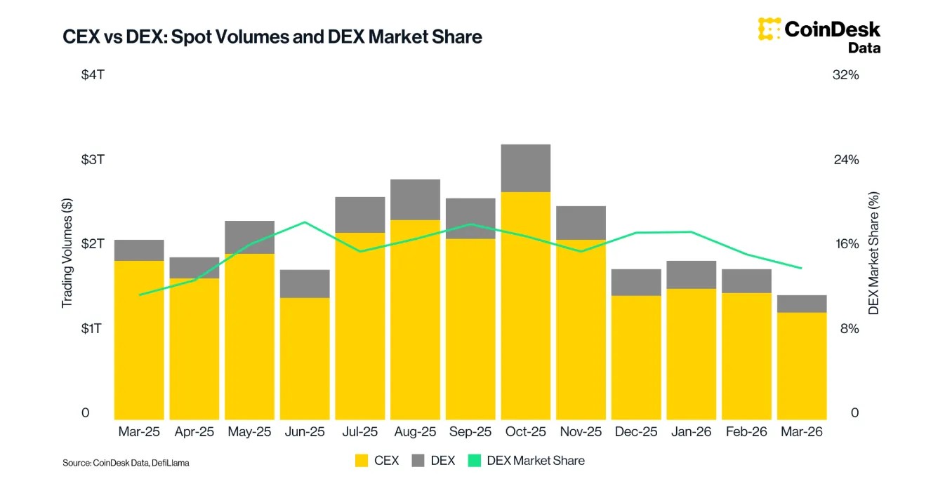 Децентрализованные биржи продолжили терять позиции по обоим направлениям. Спотовый объем DEX упал на 23,9% — до $212 млрд, а доля в спотовых торгах снизилась до 14,3%. Это минимум с апреля 2025 года.