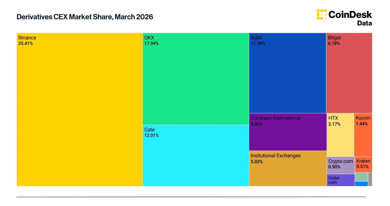 Деривативы заняли 76,5% совокупного оборота централизованных криптобирж (CEX) в марте — это максимальный показатель с сентября 2023 года. Золото впервые вошло в пятерку крупнейших активов по фьючерсному объему, а доля DEX в спотовых торгах опустилась до минимума за год. Binance удержала первые позиции по объемам, доле рынка и открытому интересу (ОИ), следует из мартовского Exchange Review аналитического подразделения CoinDesk.