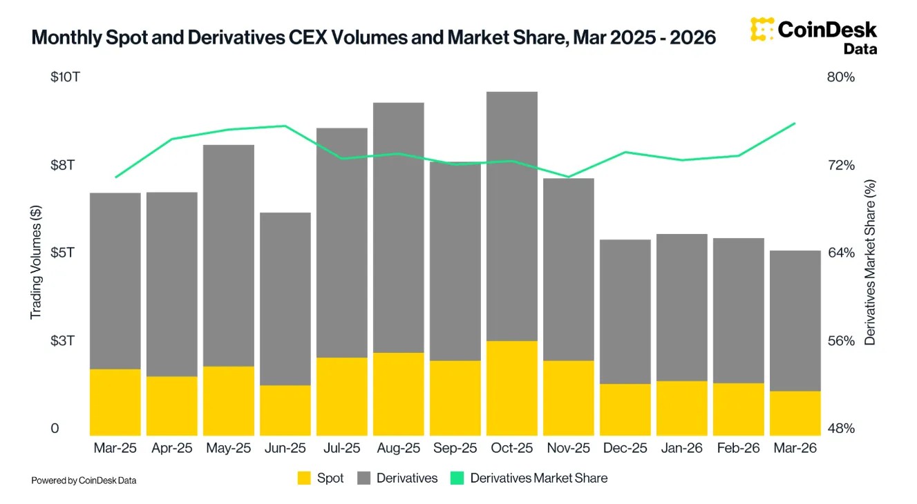 Объем торгов деривативами на CEX составил $3,99 трлн — на 3,2% ниже февральского показателя. Спотовые объемы просели заметнее: -15,7%, до $1,27 трлн. Разрыв между сегментами усилился: доля деривативов в совокупном обороте CEX выросла до 76,5% — максимума с сентября 2023 года.