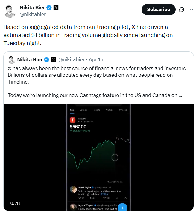 По словам руководителя отдела разработки продуктов компании Х Никиты Бира, с момента запуска пилотного проекта с хэштегами (Cashtags) 14 апреля объём торгов на платформе X составил ошеломляющие $1 млрд.