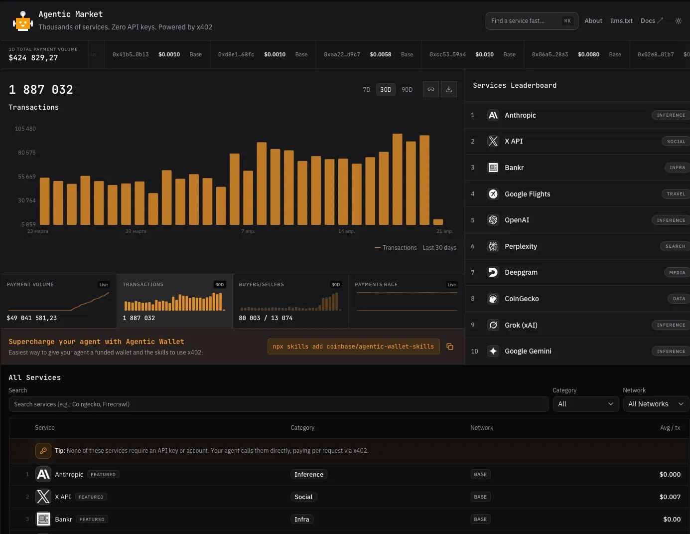 По словам топ-менеджера, рынок представляет собой «витрину для поиска, сравнения и использования сервисов x402». Он предлагает доступ к «широкому спектру приложений и веб-сайтов, которыми могут пользоваться ИИ-агенты».