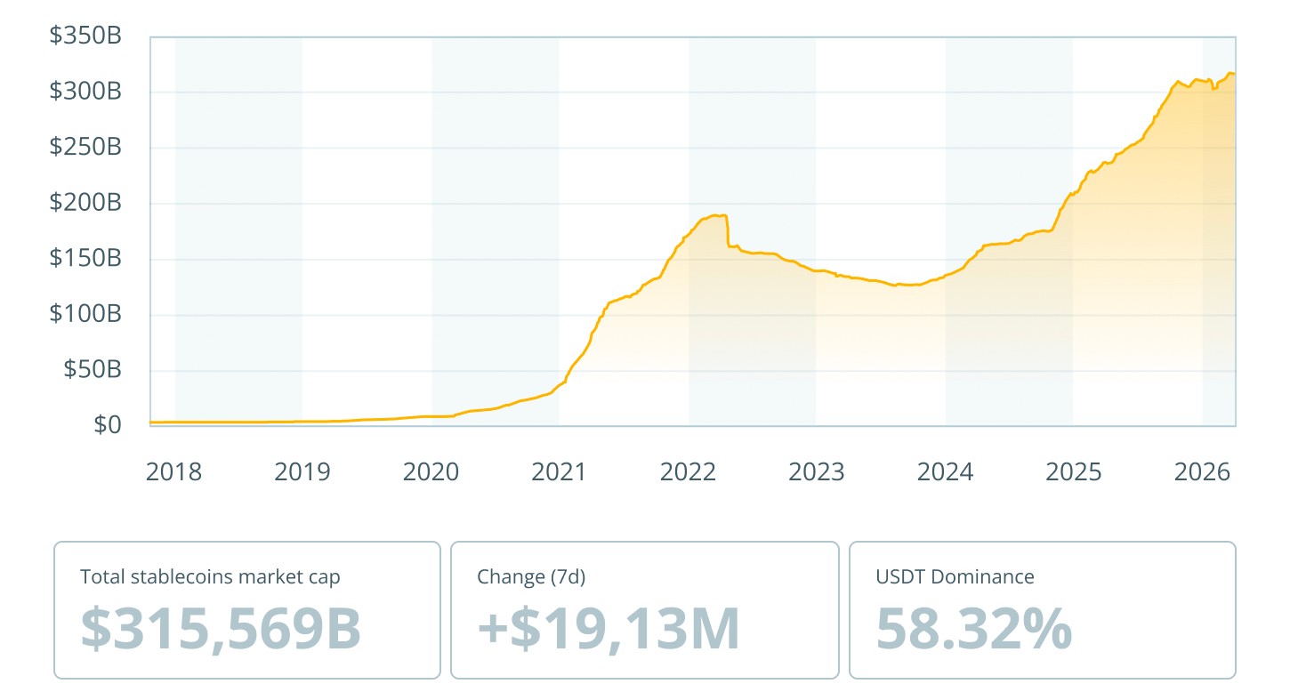 Капитализация рынка стейблкоинов с 2018 по март 2026 года. Источник: DefiLlama