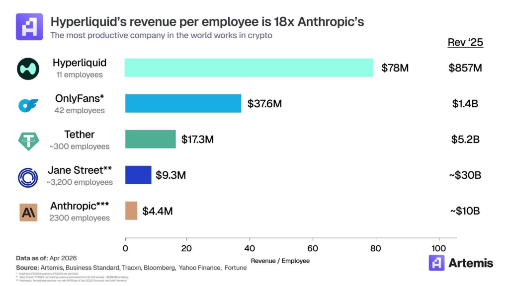 Для тех, кто не в курсе, Hyperliquid работает с командой менее 15 сотрудников. Artemis также сообщила, что в 2025 году компания получила доход на одного сотрудника в размере 78 миллионов долларов.