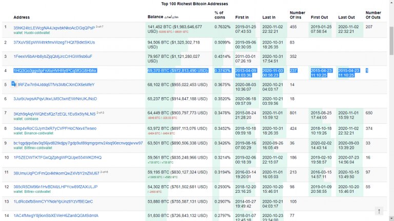 4 ноября 2020 года, 69 369 BTC были перемещены с адреса 1HQ3Go3ggs8pFnXuHVHRytPCq5fGG8Hbhx на адрес bc1qa5wkgaew2dkv56kfvj49j0av5nml45x9ek9hz6. Комиссия при этом составила всего 0,00087980 BTC (около 12 долларов), что многое говорит о преимуществах использования криптовалюты для перевода больших сумм денег. На момент написания материала сумма транзакции была эквивалентна 972 миллионам долларов.