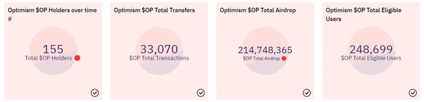 По состоянию на вечер вторника, согласно данным Dune Analytics, общий размер эирдропа OP составлял 214 млн, количество транзакций с токеном превысило отметку 33 тыс., а число ходлеров монеты составляло 155.
